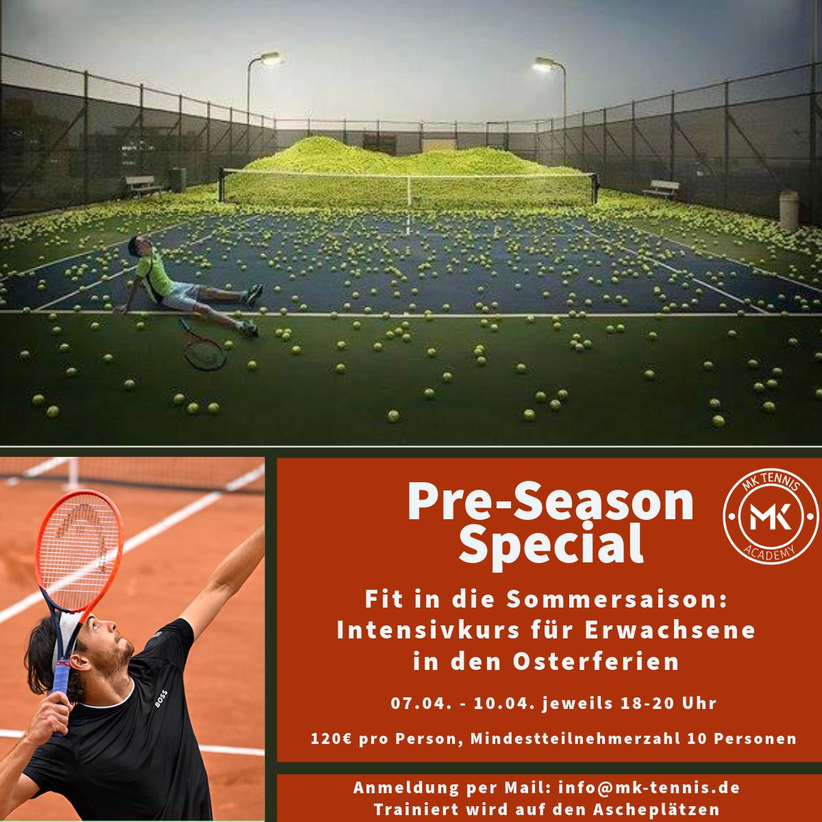 Das Pre-Season Special findet vom 07.04. bis 10.04. statt, trainiert wird jeweils von 18-20 Uhr auf Ascheplätzen.